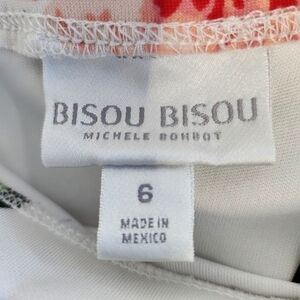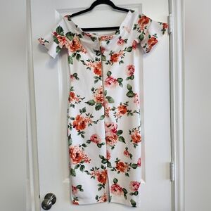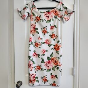 Step into elegance with this Bisou Bisou dress, featuring a chic off-the-shoulder neckline and flutter sleeves. The ruffled bodycon design in white and pink makes it an ideal choice for wedding guest or cocktail occasions. Its sheath silhouette ensures a flattering fit, perfect for making a statement.