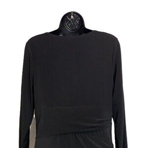 Bisou Bisou black midi dress long sleeve sheath dress V-neck cocktail dress party dress size 12 formal dress date night outfit flattering ruched dress classy black dress built-in padding fitted evening dress new with tags stretchy little black dress knee length sheath elegant black dress modern classic dress semi-formal outfit special occasion dress machine washable dress women's formalwear timeless black dress office to evening look holiday dress soft stretch fabric fall winter spring event dress wardrobe essential slimming dress chic LBD flattering party dress wedding guest outfit stretch