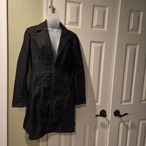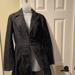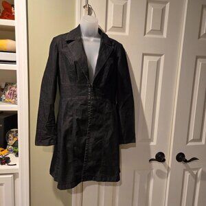 Bisou Bisou Y2K Dark Denim Jacket Size Medium - a little on the smaller size. Excellent preowned condition, minimal wear, no major flaws. Super cute Y2K 90s vibes denim jacket, dark wash that looks black in some lights. Collared, long sleeves. Super cool metallic hook closure in the mid section that flares out the bottom part of the jacket. V-neckline deep. Lighter colored stitching. Classic denim jacket with cool unique features. Blazer denim style jacket. Long denim jacket length. Jean jacket. Medium length.