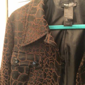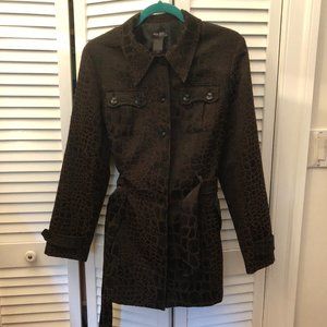 Bisou Bisou by Michele Bohbot burgundy/maroon coat with scale prints, front pockets, and two side pockets, belted and fitted, Size L, but more a size M--Measures: pit to pit 19" , height 29", shoulder 16"--cute coat for back to school