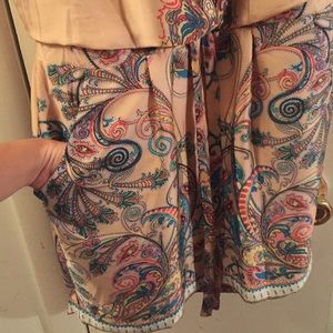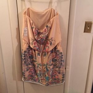 Suuper cute NWT strapless dress. Peach with multi colored design- drawstring waist and POCKETS!!