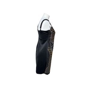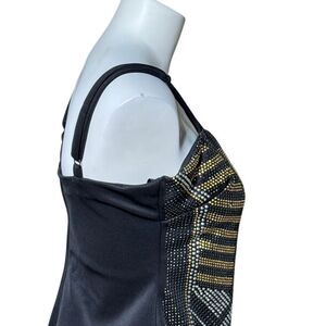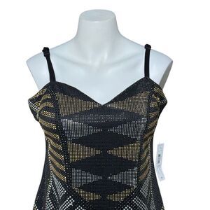 Bisou Bisou Michelle Bohbot NWT black gold and silver rhinestone studded bodycon dress size 10. Spaghetti straps. Zipper back. Sweetheart neckline. Has some stretch. 90% polyester 10% spandex. Lining 100% polyester. Length approximately 37” (straps are adjustable). Chest 18”.