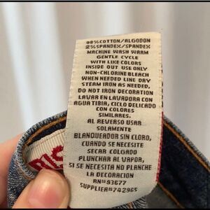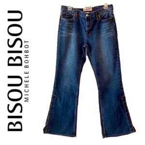 Embrace a timeless style with these Bisou Bisou jeans, featuring a flattering flare and wide leg design. The medium-dark blue wash with subtle fading adds a touch of vintage charm, making them perfect for any casual occasion. Crafted from traditional denim, these jeans offer both comfort and a chic, worn-in look. Iconic Vintage Bisou Bisou Denim Jeans. Minor fading, bedazzled belt loops and slit hem. Roughly 31” inseam 16” flat measure waist. 9” rise Bootcut flare late 90s/Y2K cut Bin L #y2k #nineties #wideleg #fitandflare