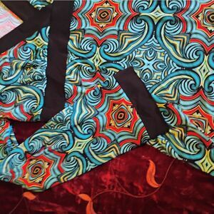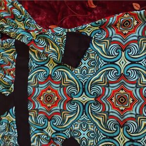 Elevate your style with this Bisou Bisou blouse, featuring a striking blue and red graphic wrap design. The long sleeves and tunic style make it perfect for both casual and chic occasions. Crafted with attention to detail, this top offers a comfortable fit and a unique look.