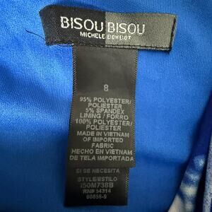 Ships out within 1 business day of purchase. This beautiful dress from the designer brand Bisou Bisou by Michele Bohbot offers a striking blue-teal-brown abstract floral print, an empire waist with decorative button details, wide shoulder straps, and a tie at the back for adjustable fit. The fabric is 95% polyester and 5% spandex with a 100% polyester lining, made in Vietnam. Its sleeveless silhouette and flared skirt make it versatile for daytime or evening wear. Please review all photos to ensure you are comfortable with the condition and styling.