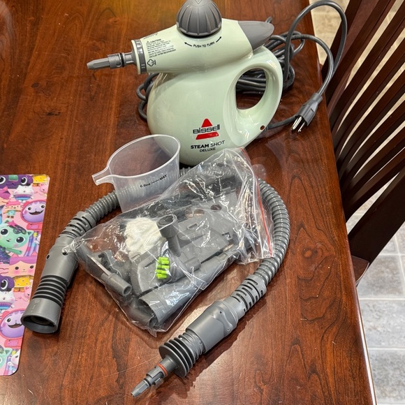 Compact Bissell cleaner with multiple attachments. Includes flexible hose and measuring cup.
