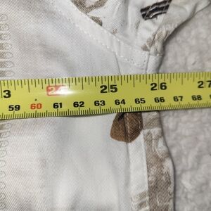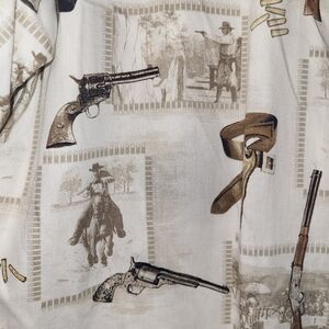 Cream and tan Old West cowboy style shirt from Bit & Bridle! Short sleeves with chest pocket. Size Large. Pre-owned and in excellent condition. Features old west scenes and cowboys with horses. 100% cotton.