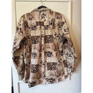 Vintage-style Bit & Bridle button-down shirt in a unique wildlife and hunting dog print. Features a collage of retrievers, ducks, and nature scenes in warm brown tones. Made from 100% cotton, this classic outdoorsman shirt is perfect for sporting events, casual wear, or collectors.