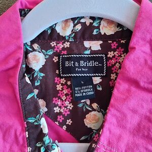 Excellent condition! Sleeveless Western shirt. Pear Snsp buttons on the front and the chest pickets. Great details of stitching and calico yoke. Awesome shirt for your summer Ranch wardrobe! Rodeo, Barrel Race, Horse Camp or coffee out on the veranda. 5% spandex allows for great stretch around the middle.