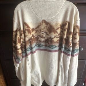 Experience warmth and style with this Bit & Bridle Teddy Jacket, featuring a cozy cream and brown color palette. The jacket showcases a unique scenic mountain design, adding a touch of nature-inspired elegance. Crafted for comfort, it includes a full-length zipper, making it an ideal choice for chilly days.