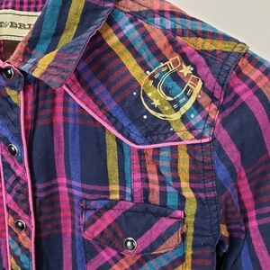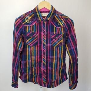 Bit & Bridle Western Pink Purple Plaid Snap Up top size small
