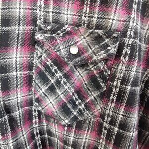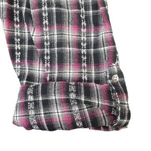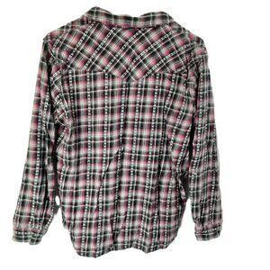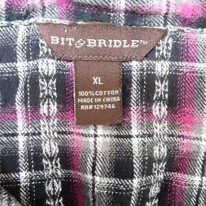 Bit & Bridle Woman's Flannel Top XL with Pearl snap closure. Perfect for western apparel, cowgirl.100% Cotton, Long Sleeve, Pockets. Fabric is soft. Pink and black in color. Top has button closure at wrist. Roll tab sleeve. Measurements are included in photos.