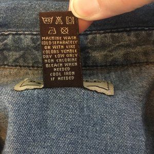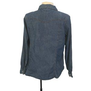 Womens blue chambray long sleeve button front shirt. Collar, white buttons, buttons at cuffs, 2 front breast pockets.