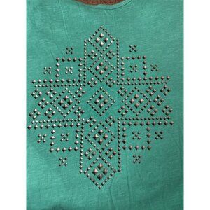 This teal tank top features a striking studded geometric design and playful fringe detailing. Its sleeveless style is ideal for warm weather.