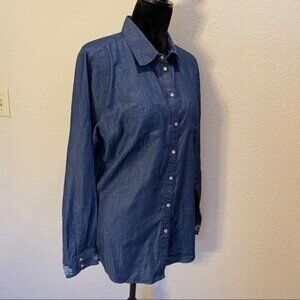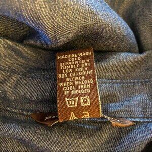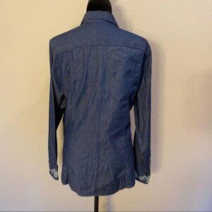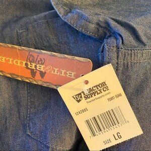 New with tags. Bit n Bridle - Jean western cowgirl shirt large. Snap down front. Long sleeves with floral pattern on cuffs. Cotton blend with rayon. 46" chest and 30" length.