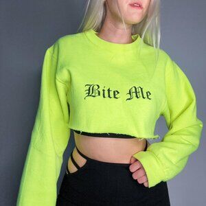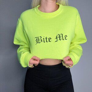 In bright highlighter yellow! Bite Me embroidered in Old English font. Originally from a friend's online shop based in LA, no longer available! Light pilling at the cuffs and under the embroidery, I'll remove as much as I can before sending! Will update photos when that is completed. Size S.