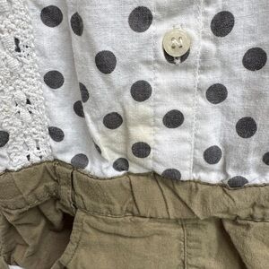 Charming kids romper featuring a playful polka dot top and olive green bottoms. Perfect for any occasion.