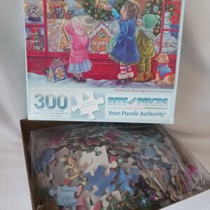 This is Bits and Pieces "Christmas Blessings" by Tricia Reilly-Matthews. It is a 300-piece puzzle that is clean and gently used one time, with all pieces accounted for and in a bag. A name is slightly noticeable on the box.