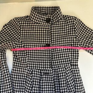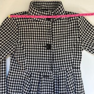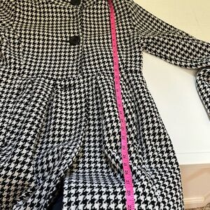 Stylish black and white houndstooth coat with button closure. Vintage and in excellent condition. Has two buttons on top and then switch to snap buttons down the jacket. 2 pockets on the side. No holes or stains.