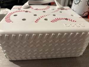 Bitty Bogg Bag in the 'Rounding Third' baseball-themed print. This compact version features a white body with red baseball stitching graphics and the signature perforated design for charms/breathability. Includes one clear interior zipper pouch for small essentials. Excellent used condition with very light marks on the exterior as shown in photos. Perfect for the ballpark, beach, or as a sports mom accessory. Durable, washable, and tip-proof. Measures approximately 11" x 8.5" x 4.5".