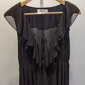 Black tiered high low dress with ruffle detail along lace up v-neck.