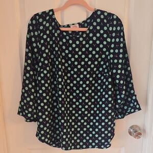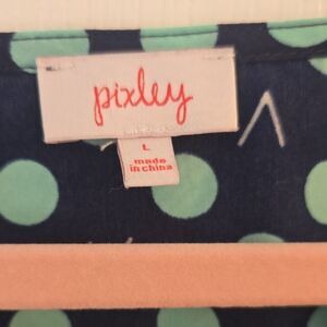 This relaxed blouse from Pixley showcases a chic navy blue and turquoise color and a comfortable boxy fit. The 3/4 length sleeves and flowing design make it a versatile addition to any wardrobe. Sleeves had beautiful pearl button details. excellent conditon.. Smoke free home.