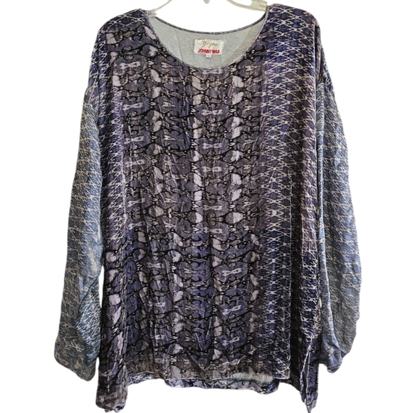 Biya Johnny Was Velvet Abstract Print Top Silk Sleeves Medium Blue Gray Oversize