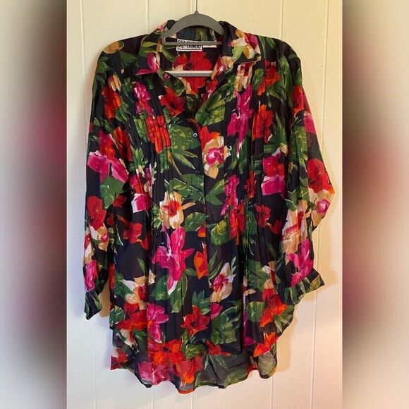 Biz Tango Blouse Women’s Medium Red Multicolored Floral Pleated Tunic
