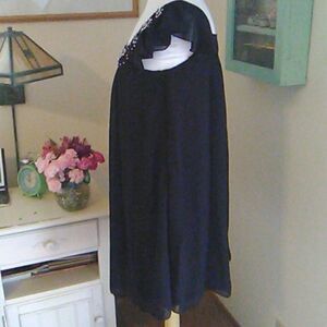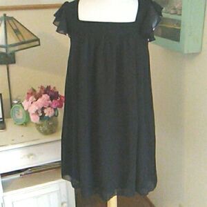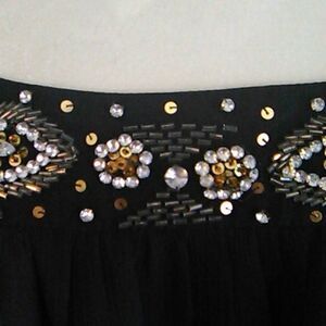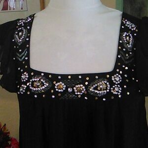 I love this dress! It has a super flattering square neckline front and back. Fluttery cap sleeves. Gathered front and back below yoke, so this flows down from the chest. Beautiful rhinestones, beads and sequins, all intact, decorate the front. Side zip, fully lined. Overlay is a full, black semi-sheer fabric. Size L measures 44 at chest, lining is 64 at bottom hem, overlay is 80 around, 37 long from shoulder to hem. A little boho, so elegant and comfortable in the most beautiful way.