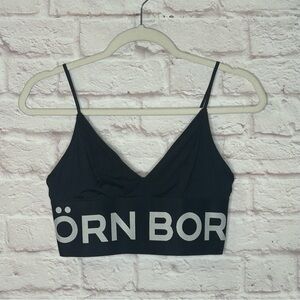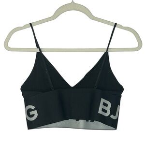 Sleek black bralette with bold logo band. Offers comfort and style.