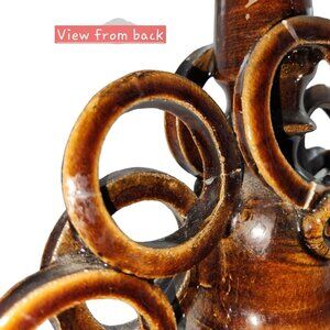 Vintage Bjorn Wiinblad of Denmark pottery candle holder. Blue and brown man juggling circles. Approximately 12.5" tall, 7.5" at widest point. This has been repaired. See photos. Two of the circles have been glued at two points. One is visible from the front only. Both are visible from the back. There is also a chip on the top rim of the candle holder. Sold as is.