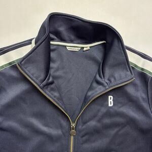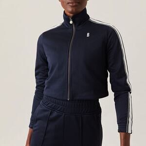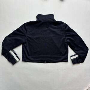 Björn Borg Maggie Track Jacket in a women’s size 40, appears to be a US size medium (8), but please see measurements. Dark navy blue cropped tennis jacket with a retro-like white, green and navy ribbon stripe down the side of either shoulder and arm, full front metal zipper, can be zipped up to achieve a high neck, embroidered “B” on the left chest. Mesh lining, elastic cuffs. Excellent preowned condition, appears to have never been worn.
