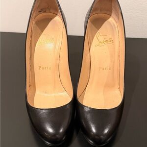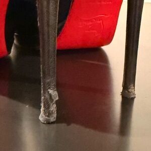 Chic black heels with signature red soles. Used. One of the heels has a tear in the heel that can be easily repaired. Shoe box and bag of extra rubber heel included.