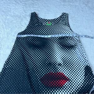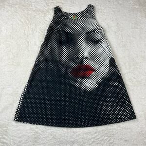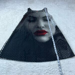 Black and white fading polka dot pattern with face graphic. Style is a trapeze, or triangle sheath, and there is no stretch. Bust was too small for me or I would have kept this one. I am a 36D. Dress is sleeveless, with crew neck. It is a pullover, there is no zipper.