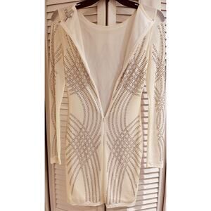 Elevate your party look with this stunning Off-White beaded dress from BlaShe. The dress features long sleeves and a knee-length pencil cut, perfect for a sophisticated evening out. The solid white color with beaded gold accents adds a touch of glamour to the dress, making it a perfect choice for a cocktail or party occasion. The dress is lined for extra comfort and comes in a size small, fitting regular size types. It is perfect for women who love to make a statement with their fashion choices. Don't miss out on the chance to own this beautiful dress, perfect for any special occasion.
