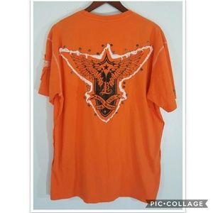 A very cool, unique t-shirt with embroidered details in front and riveted studs and awesome stitching at the back. Has also a metal logo on the right sleeve (shown in the 5th photo). 100% cotton. In Great pre-owned Condition. No holes. No rips. Smoke-free home. Feel free to ask. Open for reasonable offers. Approx. Laid flat Measurements: Pit to Pit - 23 1/2" Length - 30" (shoulder to bottom hem)