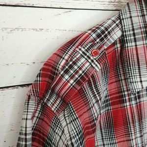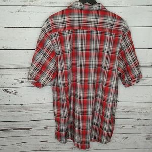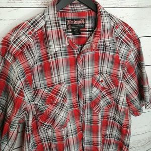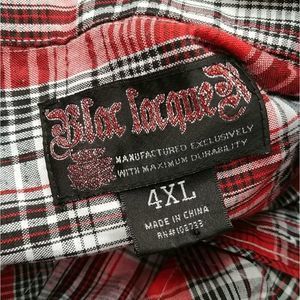 Gently used Blac Lacque red, black, and white plaid short sleeve button down shirt. Size 4XL. Approx 25 inches pit to pit
