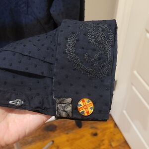 Stylish black button-up shirt with intricate embroidery details. Unique design!