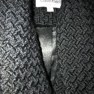 Gorgeous baffle-like weave on this black Calvin Klein 100% wool belted knee-length coat. Perfect over an outfit on a chilly night. Soft and pliable with a satin lining, fits almost more like a thick sweater but has the stand-up look of a stylish coat. Wide drape-y lapels dress up the neckline should you keep it on, and give added subtle, feminine flair. Worn ONE time. Very flattering. In perfect condition!! Suuuuper comfy.