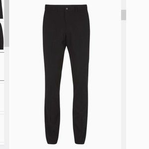 New never worn Black 2 button slim suit coat and pants. Stretch fabric, runs on the SMALL SIDE Pants are narrow at legs. buttons on sleeve and flap pocket.