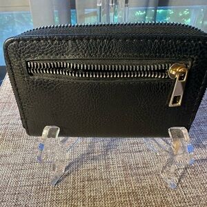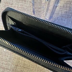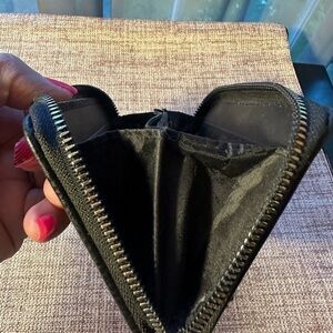 Black Faux Leather 3/4 length Wallet. It’s the perfect size, not too big, not too small. Three Card slots on each side, zipper pocket in the middle for change, and additional space on either side between interior zipper pocket and card slots. Also has an exterior Zipper Pocket. Provides lots of options for carrying cards and money.