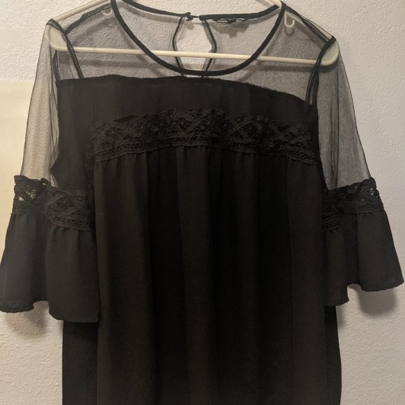 Top part of top is sheer bottom half feels like it could be silk. Arms are a bit tight.