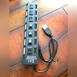 This sleek black USB hub offers seven ports for enhanced connectivity, making it an essential accessory for your computer or laptop setup. Its compact design ensures it fits seamlessly into any workspace, while the durable construction promises long-lasting use. Perfect for expanding your device's capabilities with ease.