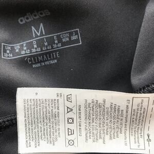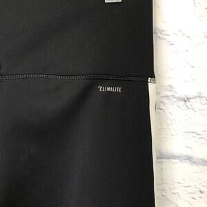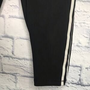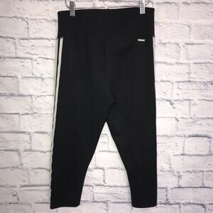 Stretchy fabric, elastic waist, black capri with 3 stripes down the sides. No stains/fabric damage.
