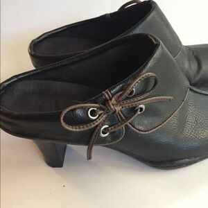 Aerology by Aerosoles Black Cinch Up Mules/Slip On. Black with brown trims. Size 6B. Heels approx: 2 1/2” BNWOT. Can be use casual, dress, night out or for work. Very comfortable shoes.