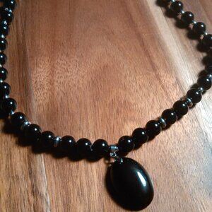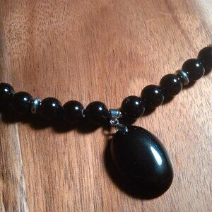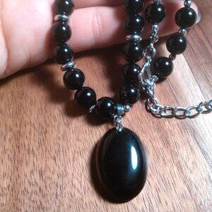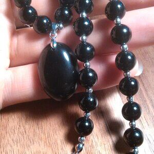 This beaded necklace features the gemstone black agate. The necklace had an adjustable length of 18 to 20 inches. The gemstones have been enhanced by heat for a more intense color. 180.5 ctw. Brand new.