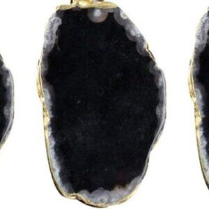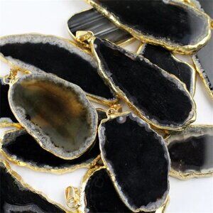 Black Agate Slice Charm Necklace w/ Gold Tone Trim, Agate Rock, Healing Gemstone