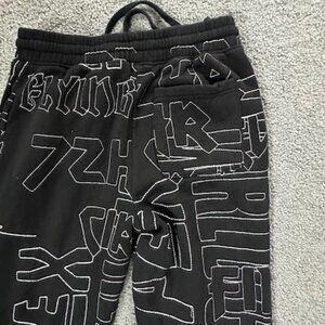 These are very heavy cotton joggers in black with All Over Embroidered Stitched Graphic Messaging.