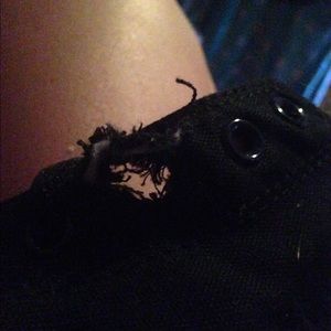 These converse are in very good condition! They have one small flaw- there's a tear in the fabric near one eyelet (see photos), but the shoes are still fully functional, and because of their dark color, the tear isn't noticeable when you wear the shoes. The initials "CD" are also written on the inside tongue of each shoe.