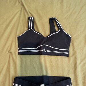 Black Alo Set - Large. Alo Yoga Airbrush Heart Throb Bra and Alo Yoga Airbrush High‑Waist Heart Throb Legging. Used once for display. Tags have been cut short, guaranteed great quality and size large. Formerly on a mannequin. Never actually worn!